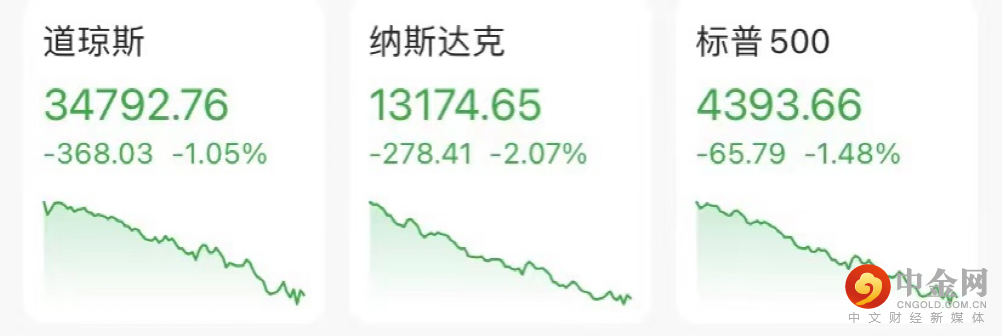 截至收盘,道琼斯指数跌1.05%,报34792.76点;标普500指数跌1.48%,报4393.66点;纳斯达克指数跌2.07%,报13174.65点。