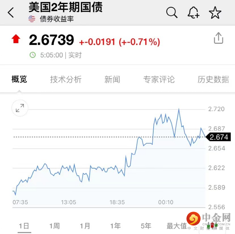 鲍威尔讲话后,对利率更敏感的2年期美债收益率一度逼近2.73%,创2018年12月以来盘中新高,到纽约尾盘日内升10.2个基点,报2.678%;10年期美债收益率涨7.7个基点报2.916%;截至收稿,皆有所回落。