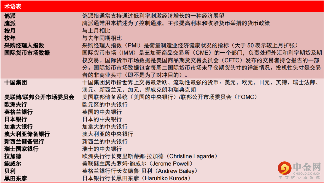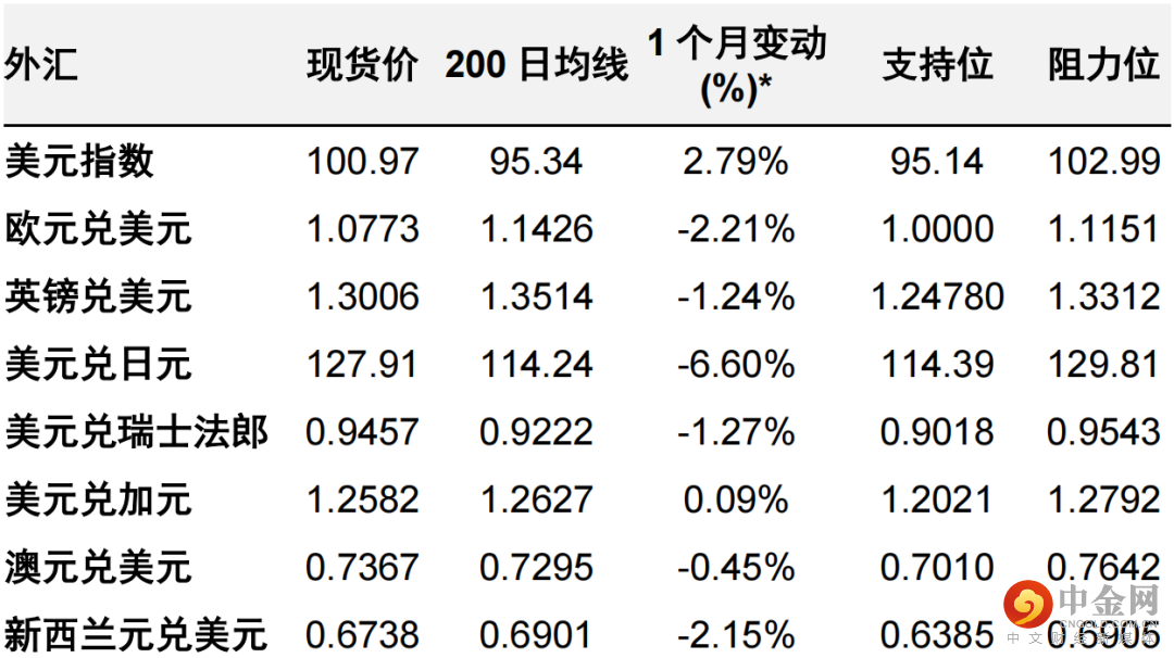 | 美元 | 美元指数自2020年中以来首次上探100;鉴于美联储的鹰派立场、全球经济增长放缓及美元避险吸引力,我们预计美元指数将会进一步上涨(但上涨速度可能比4月初放缓)。市场已计入美联储将在5月3-4日的联邦公开市场委员会会议上加息49个基点的预期(彭博资讯,2022年4月14日),但这无法排除美元上涨的可能性,因为市场也对其他十国集团央行加息有所预期。在5月会议之前,美国没有重要经济数据出炉,而美联储官员将很快进入静默期。除非地缘政治局势发生重大变化,否则美元可能处于“自动驾驶”状态。我们认为,如果货币政策紧缩、地缘政治风险和实际收入缩水导致全球经济活动萎缩,那么美元不会是比较脆弱的货币之一。 | 美元指数^ | ↑ | ↑ |