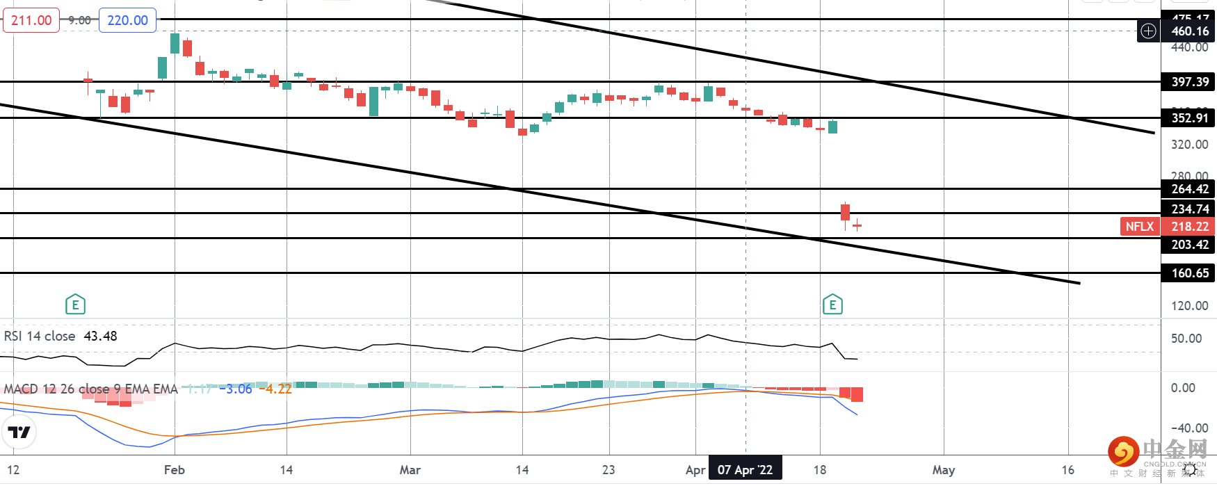 本周 Netflix 股价暴跌导致市场交易下跌以测试 203.42 水平附近的支撑位,就在熊市通道低点之前。由于 MACD 和 RSI 均看跌,近期关注的焦点是该通道继续下行至 160.65 水平。随着科技股因美联储鹰派立场的增强而承受压力,Netflix 可能需要在叙事上发生重大转变才能恢复至本周初的 352.91 点。