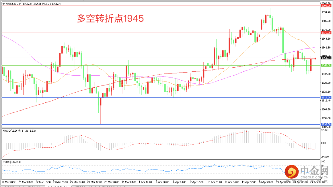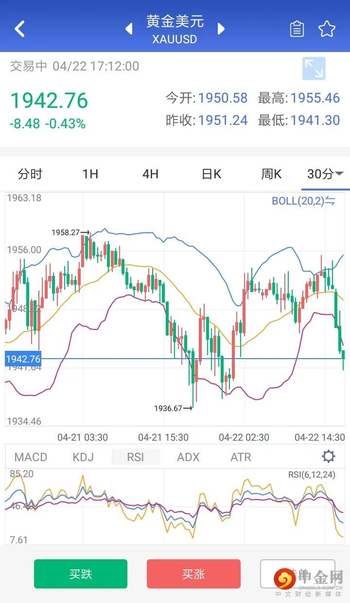 现货黄金周四震荡下行,美盘收复部分跌幅,收跌0.31%,报1951.24美元/盎司。本交易日欧市早盘,美元指数短线持续拉升,刚刚触及101关口。现货黄金快速下跌,金价跌破1950美元/盎司。周线料时隔两周后重新收跌,因美元指数继续保持强势,美联储官员对收紧货币政策采取强硬态度。