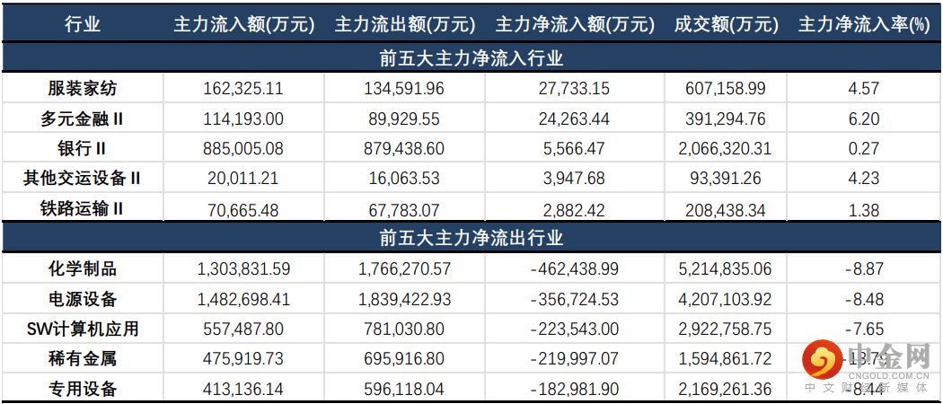 主力资金方面,两市主力持续大幅度净流出,当日净流出434.84亿元,流出量相较上日再度放大。分行业来看,服装家纺、多元金融、银行位居净流入前三位,分别获净流入2.77亿元、2.43亿元、0.56亿元;另一方面,化学制品、电源设备、计算机应用则遭主力净流出46.24亿元、35.67亿元、22.35亿元。