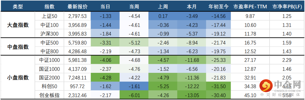大、中、小盘指数方面,大盘指数相对跌幅较小,但跌幅也均超1%;其中,上证50跌幅最小,日内下跌1.33%,收于2,797.53点;中盘指数方面,中证500当日下跌3.31%;而小盘指数则更加惨烈,中证1000、国证2000跌幅超4%;创业板指日内跌破2,300点大关,尾盘有小幅回升。