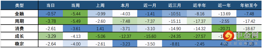 中信风格方面,周期、成长风格跌幅加大,日内跌幅均超3%;其中,周期风格当日深度回调,下跌3.78%,而成长风格惯性下跌;金融风格相对较有韧性,消费风格则再次进入下行通道,当日下跌2.61%。