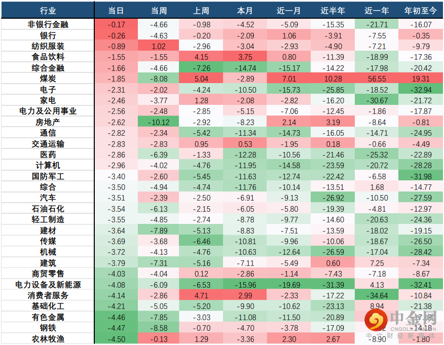 当日,30个中信一级行业均收跌,相对表现较优的行业包括:非银行金融、银行、纺织服装;而跌幅排名靠前的行业包括:农林牧渔、钢铁、有色金属。分二级行业来看,保险、国有大型银行收涨,分别上涨0.37%、0.19%;而近期表现较优的渔业、种植业、农用化工则当日分别下跌6.31%、5.96%、5.94%。