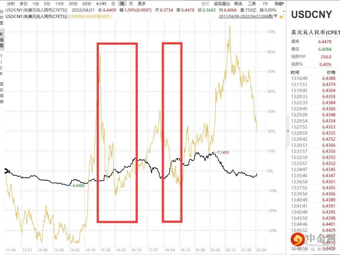 有观点认为:人民币贬值,往往伴随着股市大幅调整,如图红框处,黑线上升(人民币贬值),对应黄线下跌(沪深300下跌)。其中2015年人民币贬值12%,沪深300的跌幅为36%,2018年,人民币贬值9%,沪深300跌幅16%左右。这种说法看似非常合理,但也存在可以商榷的地方。