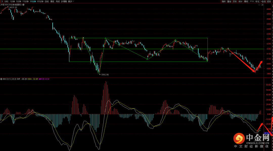 沪深300短期需要注意4035点到4061点的压制,在这个位置无法突破之前大概率会出现三十分钟的三卖结构,届时将大概率再次向下折返。从周期看大概率还需要八天时间才有望出现下一个的变盘周期点,注意把控好节奏。