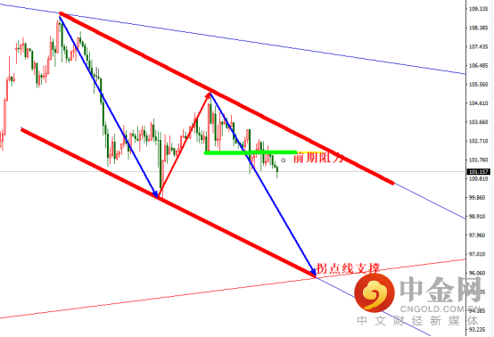 小时图的阻力在周四的低点102附近。下方第一支撑前期低点99.7,跌破后才能看到拐点线位置。