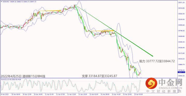 上周五(22日)美国众议院支持美国总统提供武器给乌克兰,造成道琼斯和纳指扩大下跌近3%。预期今天(25日)德国公布经济数据不佳,德指冲不过小时布林带中轨14,053,建议可偏空操作。周末美国运送军事武器援助乌克兰可能扩大战事,道琼斯冲不过小时布林带中轨33,768,建议可偏空操作。