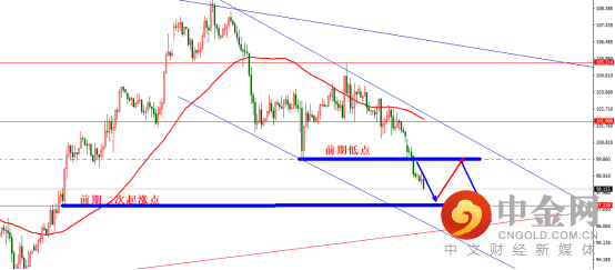 原油也是早间下破周五低点,连阴下跌,空头趋势明显,前期低点99.8,二次下跌口位置在99.18,。下方二次起涨点支撑97.2