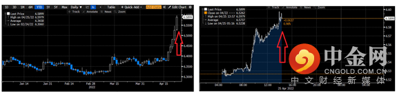 图五:今日(4月25日) 午后,人民币离岸价,进一步急跌,兑美元曾贬至近6.5980水平,再创2022年至今新低