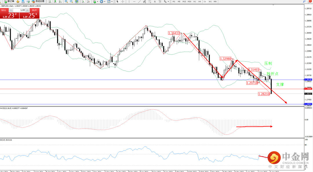 市场空头情绪延续布林带指标通道持续震荡下挫,低位抵达1.28216附近后有继续下探态势,且市场整体跌势未见最终止步迹象,布林带指标呈收口走势后开始逐渐张口,上方压制关注1.300128附近,低位支撑关注1.26842附近节点,关注1.28886附近转折点,MACD指标处于空头区域维持整理平移,RSI指标处于50均衡线下侧维持震荡下行中,如图: