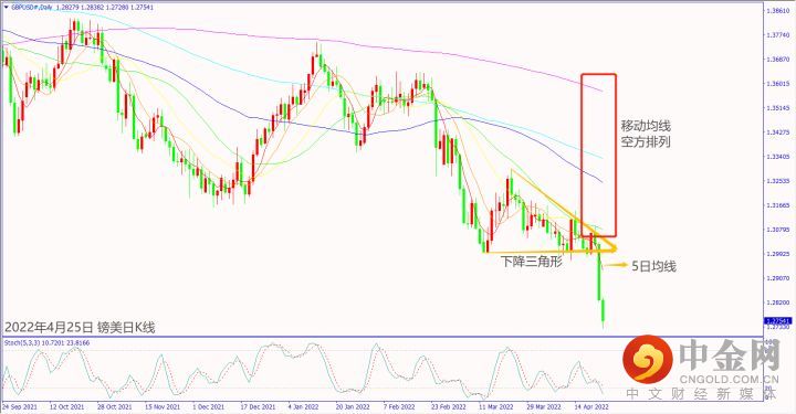 日级别线图,长阴烛掼破下降三角形底部,移动均线空方排列,可能下探新低。