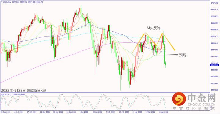 日级别线图,连续下跌出现M头反转,反弹冲不过颈线,可能延续跌势。
