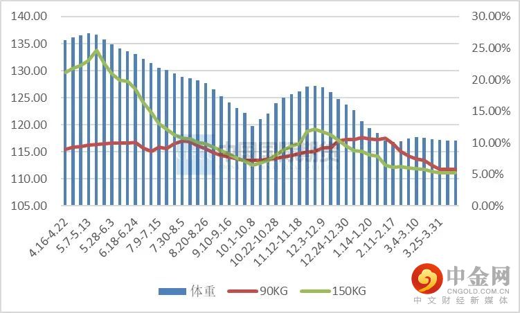 上周全国出栏平均体重117.23公斤,较前一周略涨,150公斤以上出栏占比5.21%,持平;90公斤以下占比5.79%,持平。短期内由于猪价高以及调运不畅,养殖端有压栏迹象,加上二次育肥兴起,出栏均重有微幅上涨,但预计压栏情况不会持续太久。