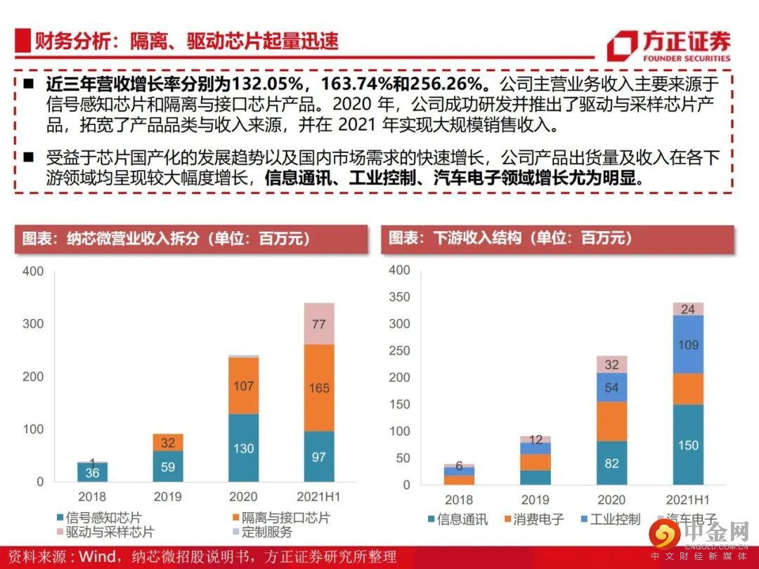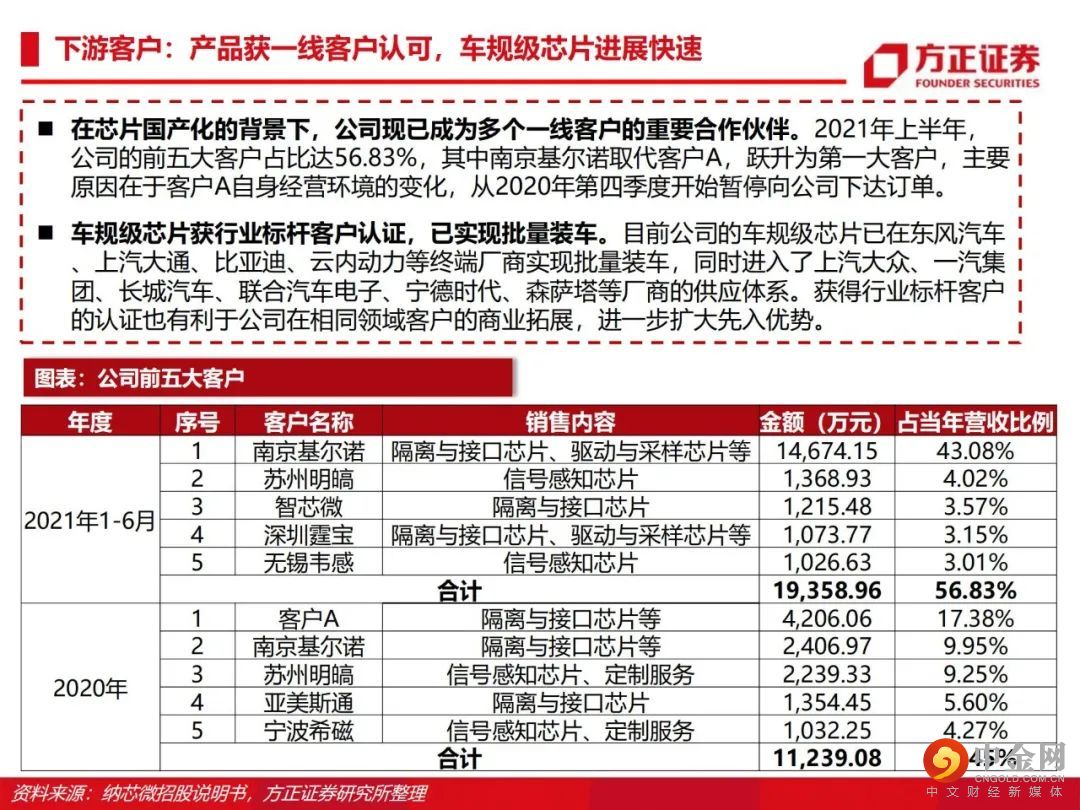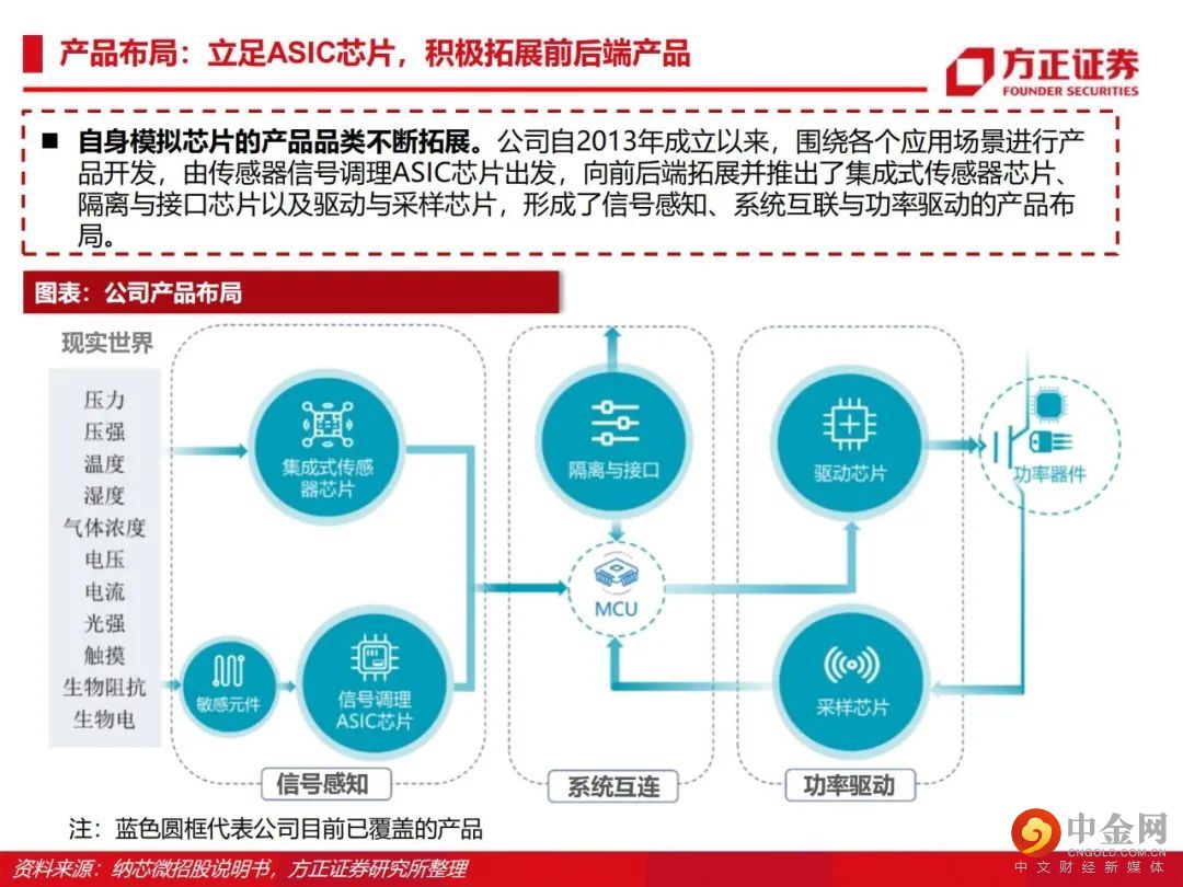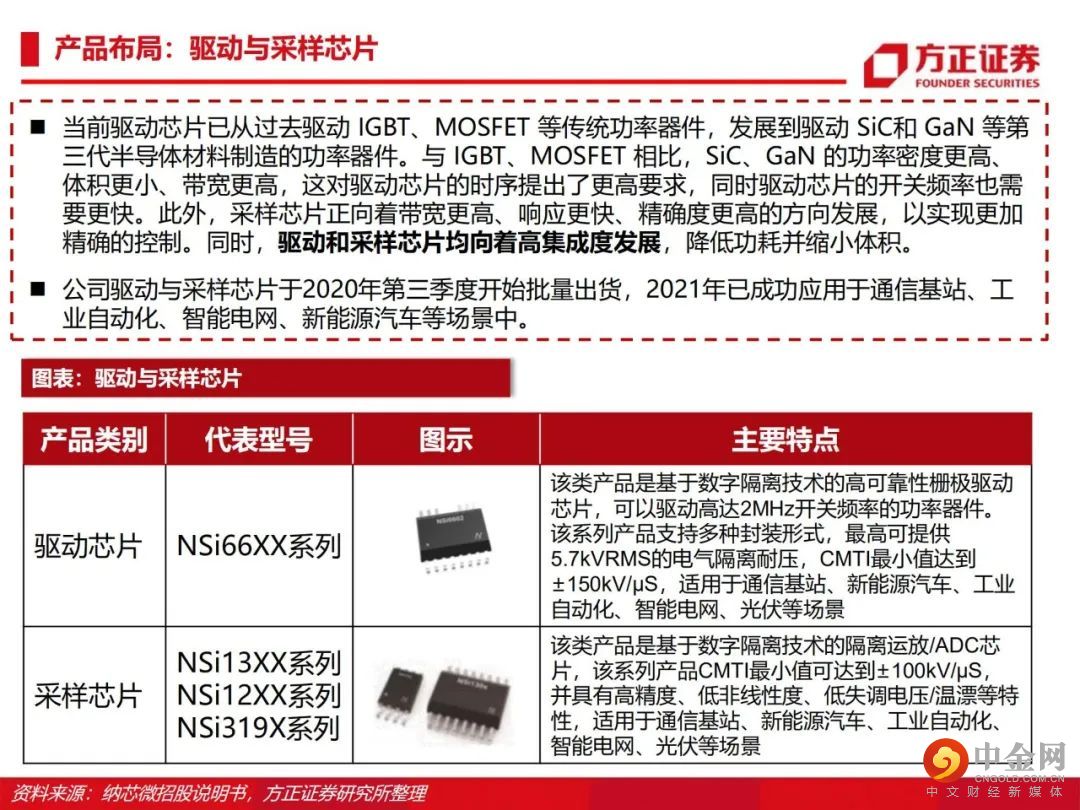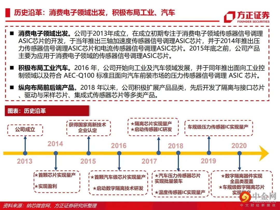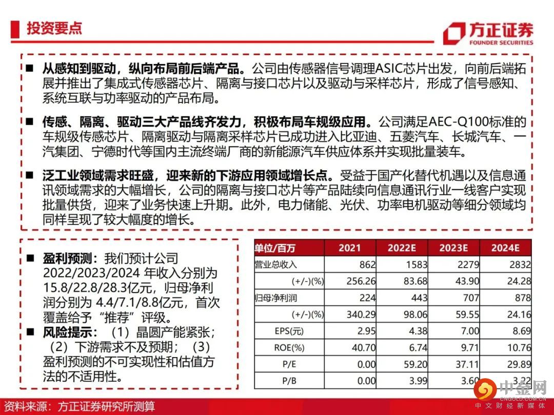 从感知到驱动,纵向布局前后端产品。公司由传感器信号调理ASIC芯片出发,向前后端拓展并推出了集成式传感器芯片、隔离与接口芯片以及驱动与采样芯片,形成了信号感知、系统互联与功率驱动的产品布局。传感、隔离、驱动三大产品线齐发力,积极布局车规级应用。公司满足AEC-Q100标准的车规级传感芯片、隔离驱动与隔离采样芯片已成功进入比亚迪、五菱汽车、长城汽车、一汽集团、宁德时代等国内主流终端厂商的新能源汽车供应体系并实现批量装车。泛工业领域需求旺盛,迎来新的下游应用领域增长点。受益于国产化替代机遇以及信息通讯领域需求的大幅增长,公司的隔离与接口芯片等产品陆续向信息通讯行业一线客户实现批量供货,迎来了业务快速上升期。此外,电力储能、光伏、功率电机驱动等细分领域均同样呈现了较大幅度的增长。盈利预测:我们预计公司 2022/2023/2024 年收入分别为 15.8/22.8/28.3亿元,归母净利润分别为 4.4/7.1/8.8亿元,首次覆盖给予“推荐”评级。风险提示:晶圆产能紧张;下游需求不及预期;盈利预测的不可实现性和估值方法的不适用性。