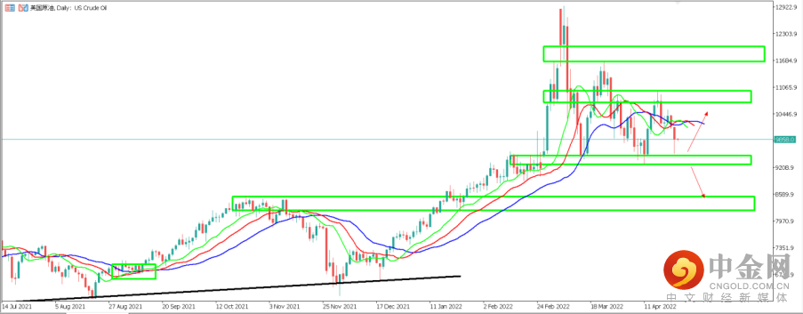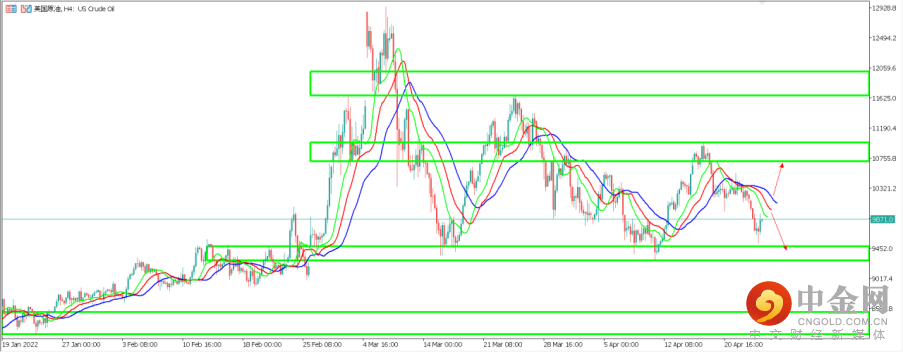 2.美国原油 USOIL:原油昨天录得近2周以来日内最大波幅,盘中价格一度跌至低点95.27附近,在日内收盘有所反弹,最终价格收盘于98.66美元附近。从天图周期来看,原油走势的三角形态还在持续,震荡空间进一步压缩,鳄鱼指标也是来回交织。目前天图重要支撑区间位于94美元一线,如价格在此区间企稳,有望继续反弹震荡,上方阻力区间位于108美元一线。反之如价格有效跌破94美元一线支撑,则下方第二支撑区间位于85美元一线。4小时周期来看,目前原油处于下跌趋势中运行,鳄鱼指标呈现空头排列。如价格持续被鳄鱼指标压制,则有望继续探底。反之价格若站上鳄鱼指标,则可能完结4小时跌势。目前价格正位于98.60一线附近运行。