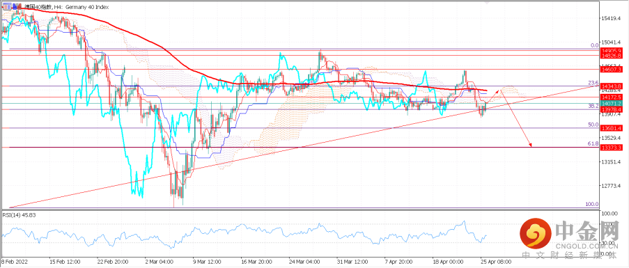 技术面看,GER40昨日最低触及13350附近,在乐观商业景气数据公布后德指似乎在短期内遏制住了空头的打压,短暂扭转了市场盘初较悲观的情绪,最终收盘收于Fibo回调线38.2%的上方,即13978.5一线。日图上看,昨日的日K线收出了下引线较长的K线形态,或暗示短期内德指或将迎来一定幅度的上修。上方压力位置可以关注:14172.5、14223、14270及14344等位置。需要注意的是14270-14344之间存在较强的压力作用,或将多头形成一定的阻力,因此GER40的上行空间可能相对有限。下方的支撑位置可以关注:13978.5、13850、13681.5及13373.3等。