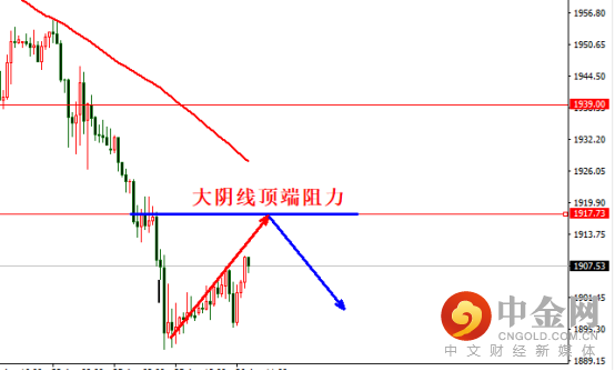 黄金昨日单边下跌后,日内震荡反弹走势,从盘面上看,反弹力度小,上升速度慢,短线行情修复后,还要继续下跌。只是我们需要把位置调整到昨日二次下跌口,大阴线顶端1917-18位置作为阻力去看空。下方支撑看日内低点1897即可。