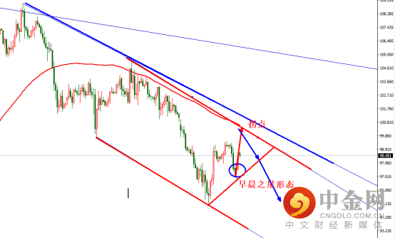 原油欧盘下跌后,小时图出现早晨之星形态,然后我注意一点,今日欧盘并没有跌破昨日低点,而是形成二次低点,这样的走势,晚上有上升空间,上方阻力位置,拐点和80日均线位置100.3-4一线。重点关注此位置的一个受阻情况,受阻可以作为进场点,下方支撑97.5-6一线。