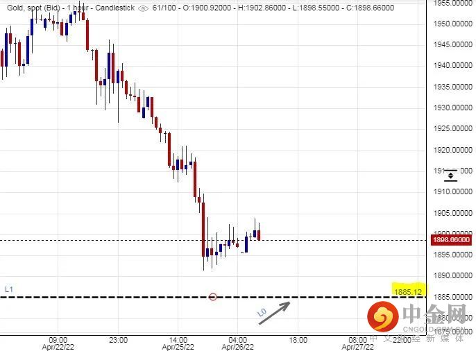 可以部署在$1,912美元左右建立淡仓盘,短线看淡金价一线至$1,885美元水平后止赚,止损在$1,920美元。