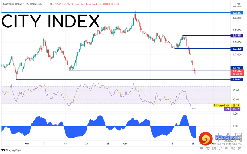 下面的4小时图底部显示,澳元/美元和美元/离岸人民币当前相关系数为-0.97。-1.00表明完全负相关,即其中一个货币对上涨,另一货币对随之下跌。而-0.97已非常接近于-1.00,如果美元/离岸人民币准备修正,则澳元/美元可能随之上涨。另请注意,RSI处于超卖区域,表明澳元/美元或准备回升。上方直至0.7347才迎来第一个阻力位,然后上看0.7458。下档支撑位在0.7095。