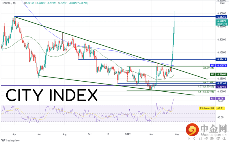 美元/离岸人民币日图在4月19日打破下降楔形后一骑绝尘。下降楔形打破后的目标为楔形的100%回档,而该货币对的此形态肇始于2021年4月1日,起始点在6.5876。站上6.3910的楔形上轨趋势线后只用了5天时间就将整个下降楔形回档完毕。