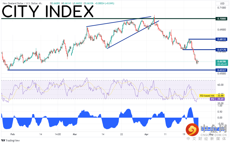 纽元/美元和美元/离岸人民币在4小时图上的相关系数与澳元/美元和美元/离岸人民币的相关系数差不多,报在-0.94。请注意,纽元/美元的RSI同样处于超卖区域,表明价格可能回升,上方阻力先后落在0.6717和0.6813。但价格如果继续下跌,直至0.6533才有第一个支撑位。