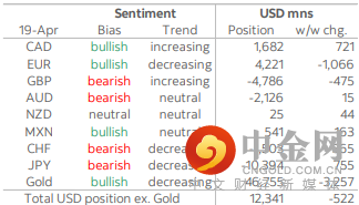 在美元兑我们在本报告中涵盖的所有货币(加元除外)上涨的时期内,美元总体看涨头寸连续第三次下跌。继上周下跌 14 亿美元后,整体头寸下跌 5.22 亿美元,总额为 123 亿美元,较 3 月底的近期高点约为 40 亿美元。日元和瑞郎本周几乎落后于所有主要货币,在兑美元收益率差扩大的影响下,兑美元分别下跌 2.7% 和 2%。然而,随着空头总额下降和多头总额增加,他们各自的看跌头寸在此期间略有减少。投机者减少了 7.55 亿美元的大型日元空头至总计 104 亿美元,超过了上周兑日元 6.48 亿美元的走势。就瑞士法郎而言,前两周 3.65 亿美元的转亏为空,令对瑞郎的空头空头达到 15 亿美元。