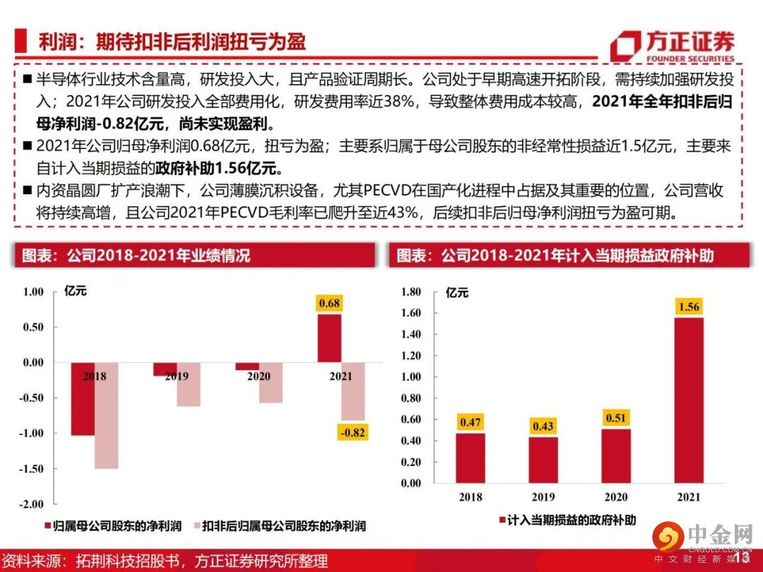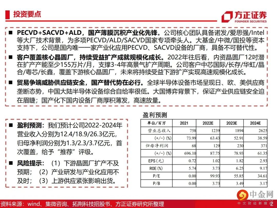 PECVD+SACVD+ALD,国产薄膜沉积产业化先锋。公司核心团队具备诺发/爱思强/Intel等大厂技术背景,为多项PECVD/ALD/SACVD国家专项牵头人。大基金/中微/国投等资本支持下,公司是国内唯一一家产业化应用PECVD、SACVD设备的厂商,具备不可替代性。客户覆盖核心晶圆厂,持续受益扩产成就规模化成长。2022年往后看,内资晶圆厂12吋潜在扩产产能至少155万片/月,支撑3-4年高景气扩产周期。公司客户中芯国际/长存/华虹/晶合/粤芯/长鑫,覆盖下游核心晶圆厂,未来将持续受益下游扩产实现高速规模化成长。贸易争端威胁供应链安全,国产替代势在必行。全球半导体设备市场呈现日、欧、美供应商垄断态势,中国大陆半导体设备综合自给率很低。大国博弈背景下,保证产业供应链安全迫在眉睫;国产化下国内设备厂商厚积薄发,高速放量。盈利预测:我们预计公司2022-2024年营业收入分别为12.4/18.9/26.3亿元,归母净利润分别为1.3/2.3/3.7亿元,首次覆盖,给予“推荐”评级。风险提示:下游晶圆厂扩产不及预期;产业研发与产业化应用不及时;上游供应紧张影响出货。