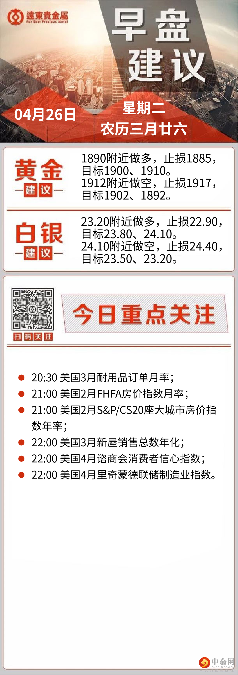 展望本交易日投资者需要继续关注俄乌局势和新冠疫情相关消息,联合国秘书长古特雷斯周二将前往莫斯科,与普京会面,并与俄罗斯外交部长拉夫罗夫举行工作会议和共进午餐。经济数据方面,需要关注美国3月耐用品订单的表现,目前市场预期比较乐观,数据公布前偏向利空金价。联合国秘书长古特雷斯定于4月26日在莫斯科与俄罗斯外长拉夫罗夫举行工作会议,之后还将与俄罗斯总统普京会面。晚间关注美国多项经济数据,包括美国3月耐用品订单月率、美国2月FHFA房价指数月率、美国3月新屋销售总数、美国4月谘商会消费者信心指数、美国4月里奇蒙德联储制造业指数等。
