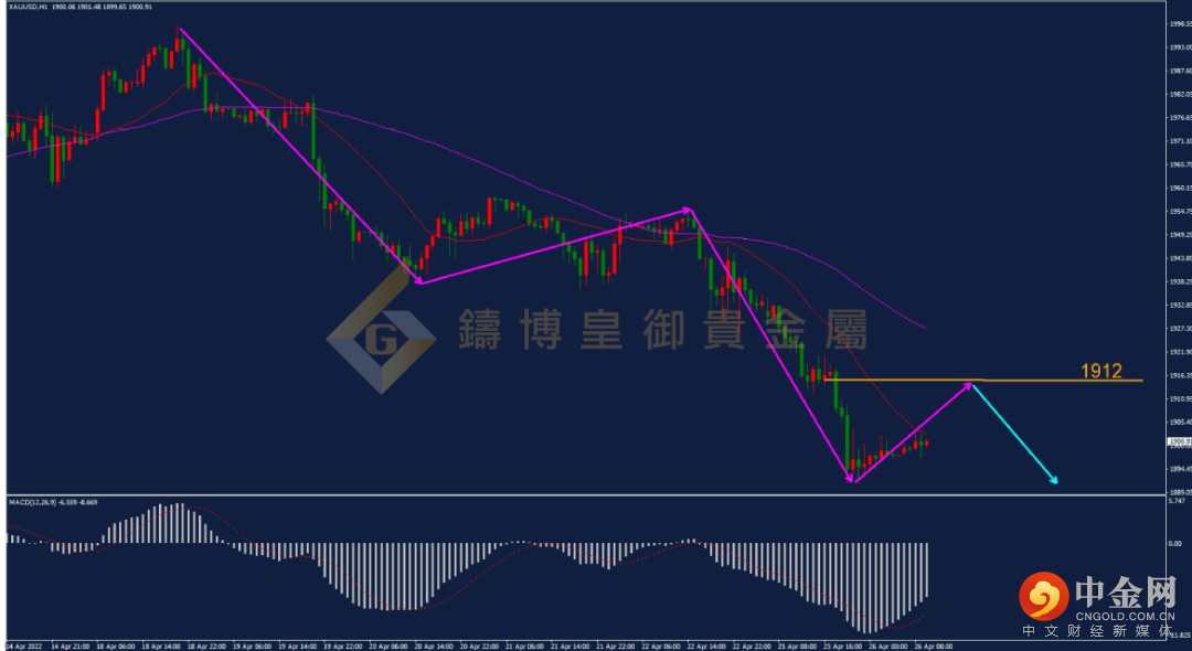 从1小时周期看,自触及1998.1,靠近两千整数关口以来,黄金走出单边下跌,结构上有倒V顶部形态出现,从昨天的下跌结构形态上看,下跌的高点不断降低,低点也在持续降低,代表处于下跌趋势的延续阶段,从MACD指标柱动能上看,目前未出现底背离信号,代表还会存在新低,建议日内高空为主,上方重要阻力位在1912附近,建议日内在重要阻力位附近受阻时,可考虑轻仓尝试布局空单。
