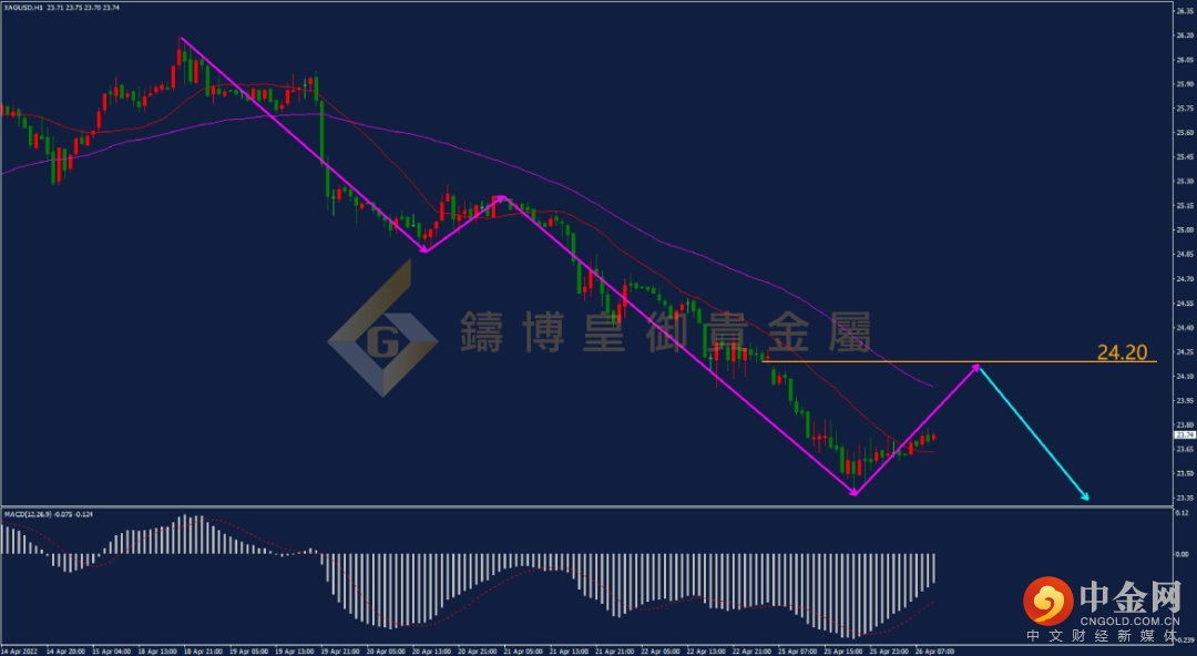 从1小时周期图看,自白银最高触及26.20附近以来,走出单边下跌,形态上类似黄金,有倒V反转形态结构出现。从昨天的下跌形态上看,下跌的高点不断降低,低点也在持续降低,代表处于下跌趋势的加速阶段,再看MACD动能,目前未出现底背离信号,代表还会存在新低,建议日内高空为主,上方关键阻力位在24.20附近,建议日内在重要阻力位附近受阻时,可考虑轻仓尝试布局空单。