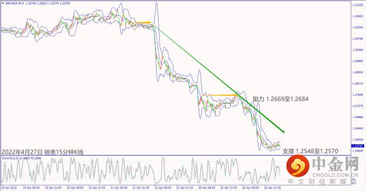 日级别线图,连4根阴烛空方钝化,一旦突破1.2600关口,可能出现反弹;15分钟K线,短线跌深易反弹,下降趋势线若刺破,大有可能挑战起跌阻力。