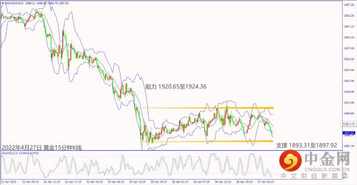 昨天(26日)受到美元指数大涨和美股大跌影响,黄金大都在1900关口上方震荡整理。预期今天(27日)欧美公布经济数据大都不佳恐利淡股指续跌,黄金价格一旦突破小时布林带上轨线1906美元,建议可短多操作。