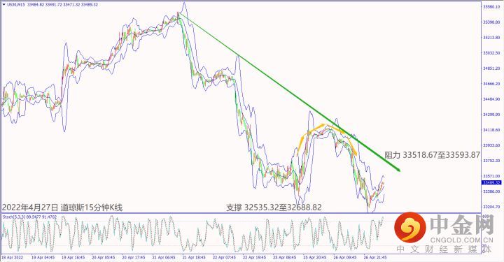 昨天(26日)俄罗斯强烈回应对军援乌克兰武器国,造成欧美股指暴跌逾3%。预期今天欧元区公布经济数据大都不佳,德指冲不过小时布林带上轨线13,786,建议可偏空操作。预期今天IMF对全球今年经济增长重申趋缓,道琼斯若跌破小时布林带中轨33,382,建议可偏空操作。