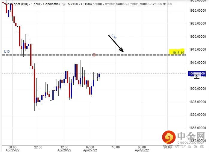 可以部署在$1,913美元左右建立淡仓盘,短线看淡金价一线至$1,882美元水平后止