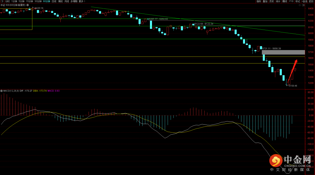 中证500出现反弹走势,而由于六十分钟的脱离段较为长一些,大概率会有三卖的结构出现,届时将会有再次的回落走势。注意中枢形成后的量能变化。
