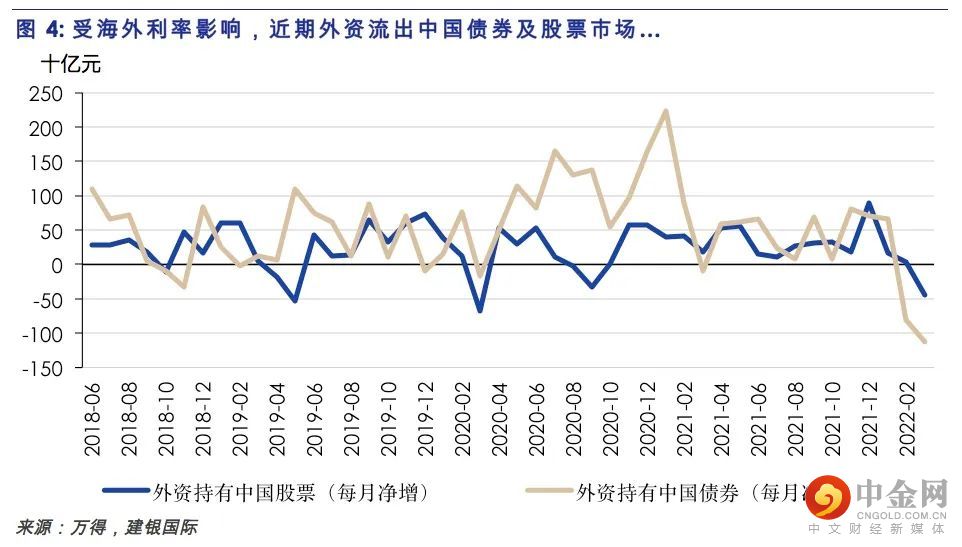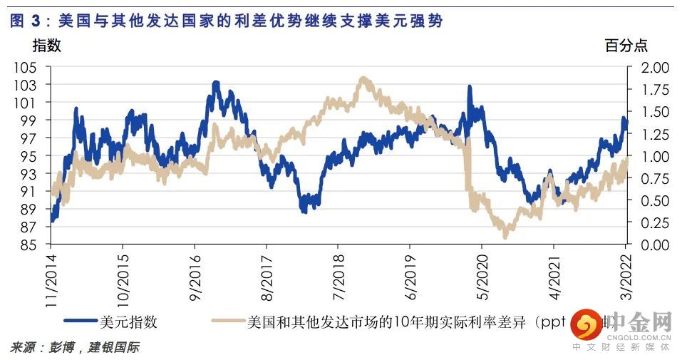 我们认为,决策者可能在五月和六月的会议上各加息50个基点,将全年加息总量推升至225个基点。如我们此前的预期,在通胀压力和美联储的鹰派立场下,市场对美联储“终点利率”的预期已从今年1月的1.7%迅速上升至目前约 2.95%的水平,并伴随美债收益率曲线的显著上移。同时,我们预计美联储或于5月开始以较快速度缩表,支持美债利率的上行,实际利率预计将进一步走高。美联储的鹰派立场和美国实际利率面临的上行压力预计会在未来几个月继续支撑美元走强(图 3)。
