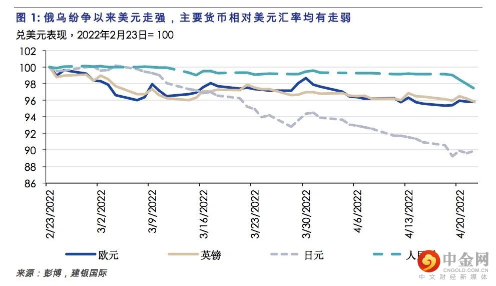 人民币兑美元汇率在过去一周多的时间里从 6.36 跌至6.55左右,下跌幅度超过 2%。美元强势是推动人民币汇率贬值的主要因素。俄乌危机以来,美元兑主要发达国家及新兴市场货币均明显走强:其中,在不到两个月的时间里日元兑美元汇率贬值超过10%,而欧元兑美元汇率则贬值约 5%(图1)。上周以来美元继续维持升值态势,美元指数飙升至101以上并一度超过其2020年3月的峰值。