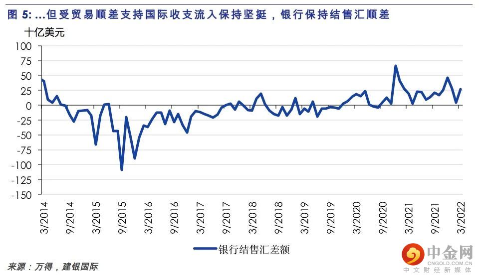 海外利率的走升,令国际资本流入中国市场出现逆转:外资在中国股票和债券市场的总体投资规模在2月和3月分别下降了 764亿元和 158亿元(图4)。不过,尽管外资净流出,中国总体的国际收支流入依然强劲。一方面,稳健的经常账户盈余亦支撑了人民币的旺盛需求。3 月中国的贸易顺差为 470 亿美元,远高于外资在中国债券和股市共约240 亿美元的净流出。另一方面,如下所叙述来自居民的资金外流压力也有限:近几个月来,银行结售汇差额为正(包括银行自身和代客结售汇),与 2015/2016年形成鲜明对比(图 5),显示市场对人民币的稳定需求。