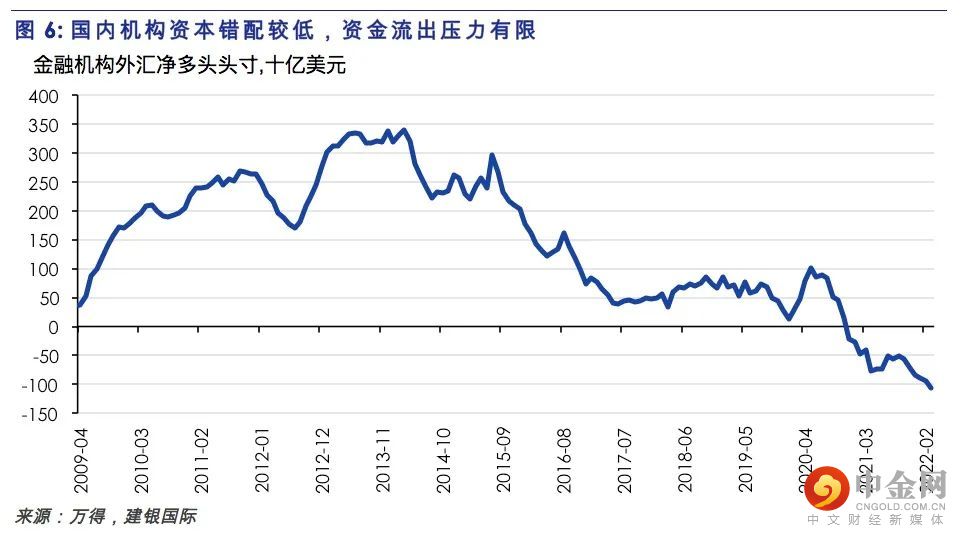 与2015年相比,国内机构目前并未出现大的货币错配,居民资金流出压力不大。事实上,由于外汇存款增速超过外汇贷款增速,境内金融机构一直保持外汇长头寸(图 6)。3 月份外汇净长头寸进一步增加,表明境内银行的外币流动性仍然充裕,人民币下行压力有限。