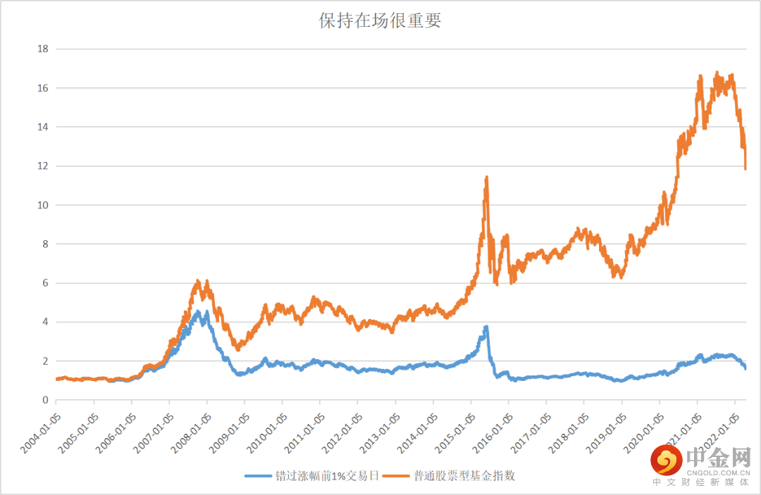 Wind数据显示,自2004年初至2022年4月25日,普通股票型基金指数累计涨幅1183%,倘若错过日涨幅前1%的交易日,最终收益仅为158%,缩水将近九成。