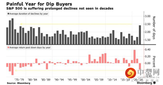 2022年至今,标普500指数的跌势平均持续了大约2天半,是1974年以来最久的一年,而下跌后的回报率为-0.2%,同样是近50年来最糟糕的。