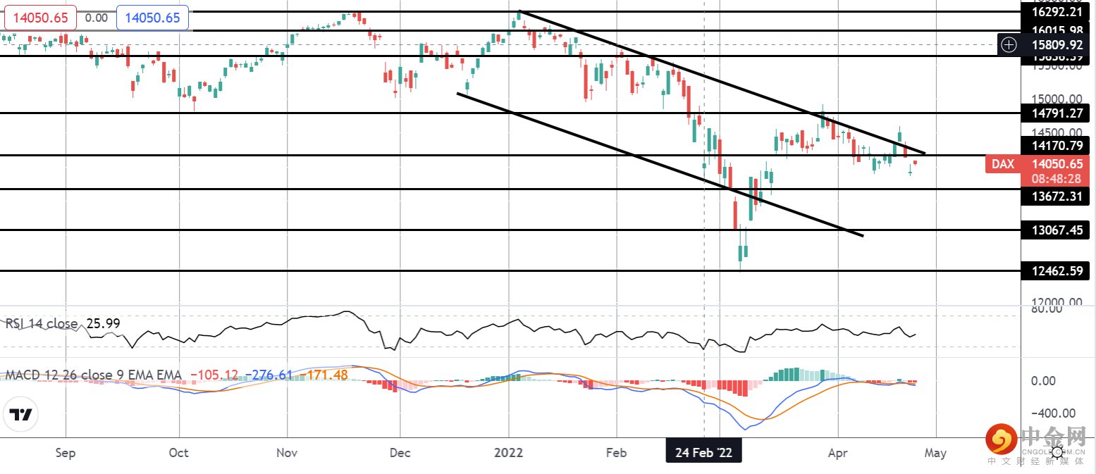 目前,DAX 继续徘徊在 14170.79 水平附近,在撰写本文时位于其下方。由于价格仍在空头通道内交易,重点是下一步进一步走低至 13672.31 水平和之后的 13067.45。多头需要突破 14791.27 水平才能影响情绪的转变,并将 MACD 和 RSI 都带回看涨区域。