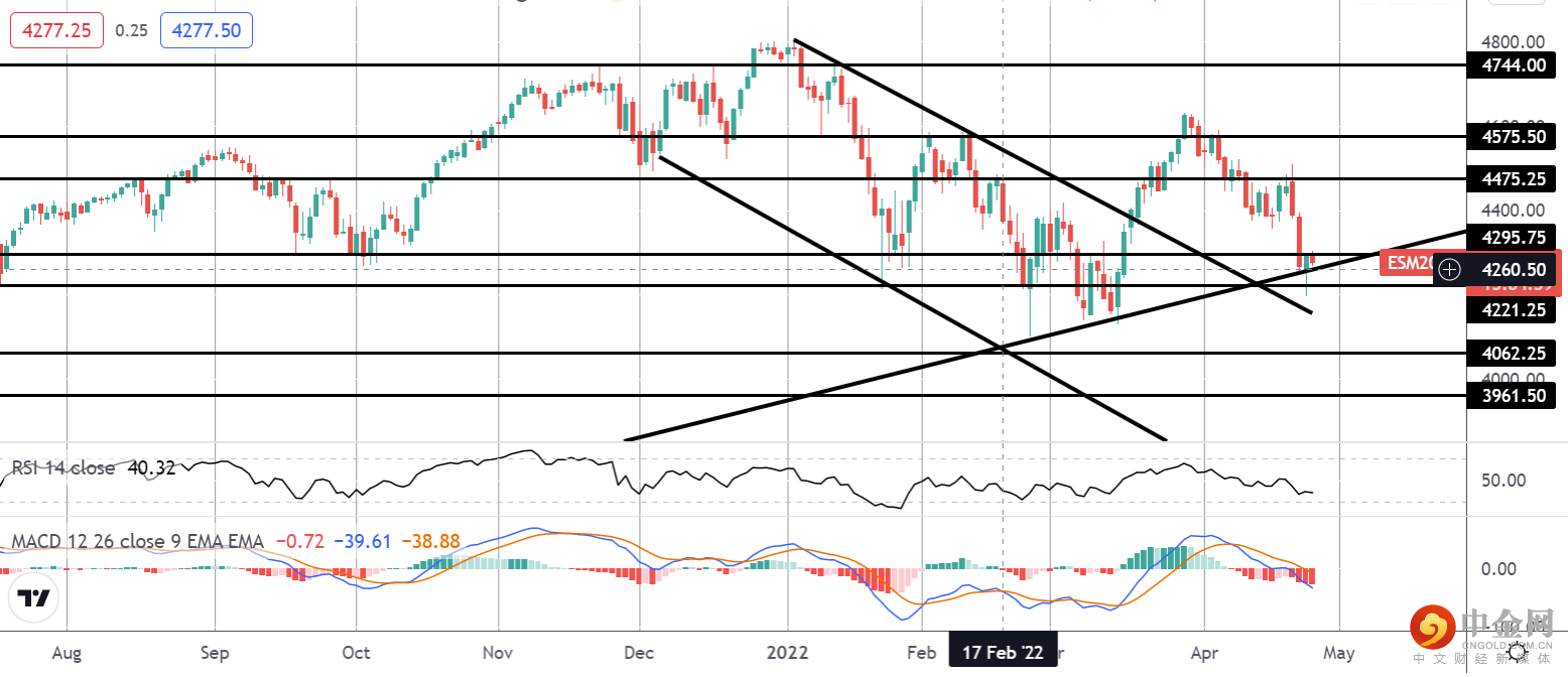 从 4575.50 水平回落,标准普尔指数回落,以测试从 2020 年大流行低点开始的长期上涨趋势线。 由于目前价格维持在该水平,并受到 4221.25 水平支撑的支撑,中期仍有继续走高的空间,将关注点放在 4744 作为更广泛的上行目标。 但是,如果我们跌破 4221.25,接下来将关注 4062.25。