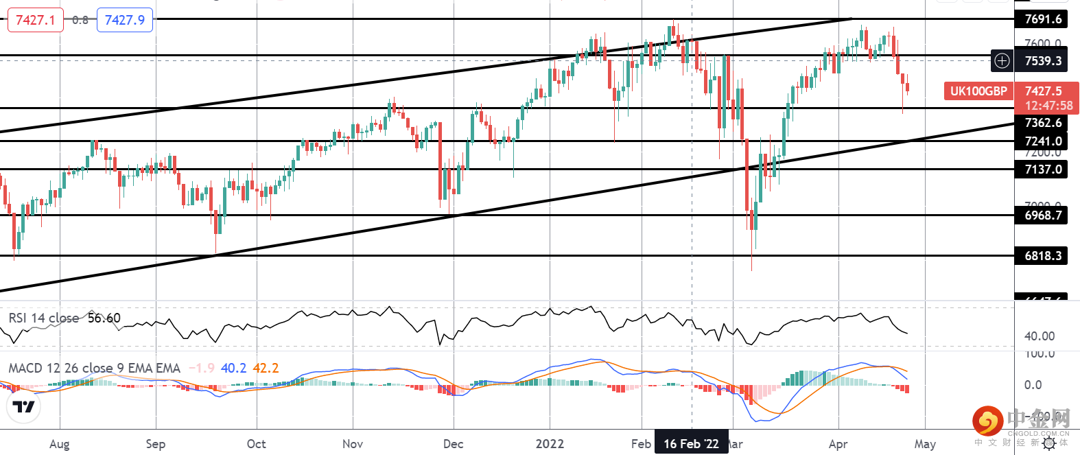 最近一次未能突破 7691.6 的抛售导致市场逆转跌破 7558.7 水平。 目前,市场在 7362.6 水平获得支撑。 由于 MACD 和 RSI 都看跌,市场很容易随着上升趋势线和 7241 的下一个重要支撑区域进一步走低。