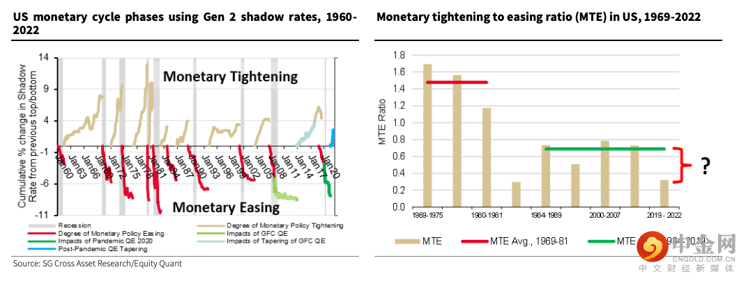 此前货币宽松阶段的货币宽松总程度(包括由疫情引发的大量流动性注入)达到了7.9%,因此,为了在这个紧缩周期中达到过去四个周期的平均MTE比率,美联储的收紧程度需要从上一个谷底收紧约542个基点(69%*7.9%)。