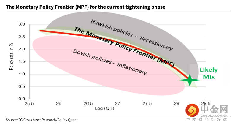 当然,紧缩的300个基点并非完全来自直接加息,有很多种加息和缩表的组合可以达到累计300个基点的紧缩。如下图所示的模型一样,红线(货币政策边界,Monetary Policy Frontier,MPF)代表累计300个基点的紧缩。