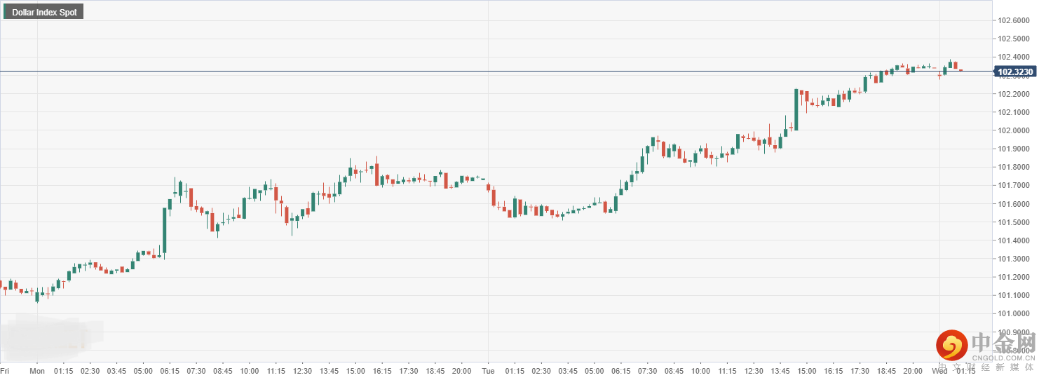美元指数周二收盘大幅攀升后,今日开盘涨0.62%至102.32附近,因加息预期持续升温且预计美联储在后三个月的会议大幅加息,使得美元获得上行空间。